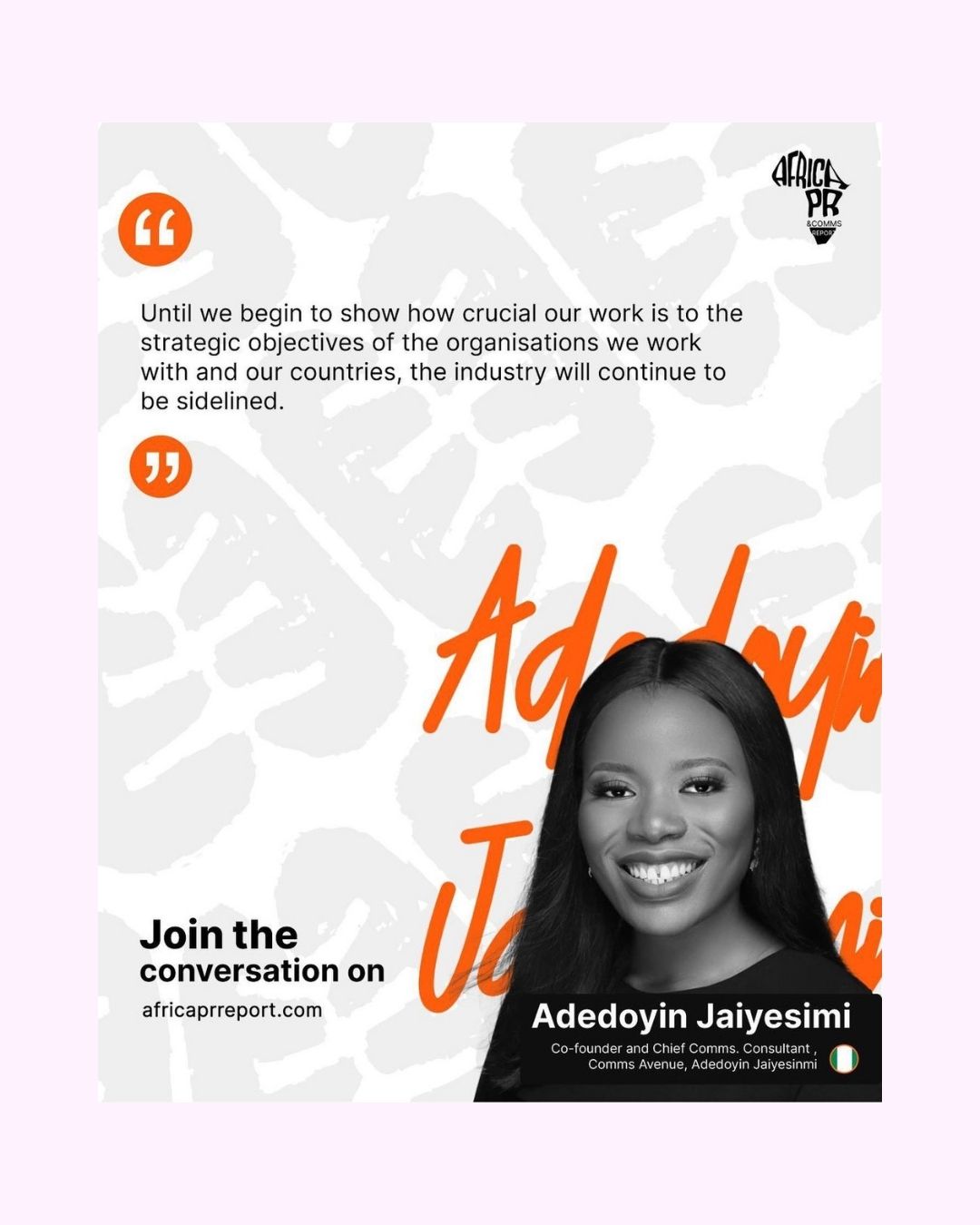 I am a certified Strategic Communications Management Professional (SCMP), a Chartered PR Practitioner and the Co-Founder of The Comms Avenue, a Pan-African capacity-building and networking platform for communications professionals. Our work is focused on raising the standard for Comms talent in Africa and we currently have over 1900 professionals from 35 African countries in our mission-driven community.